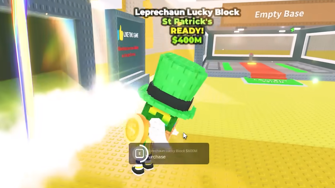 The Leprechaun Lucky Block is the centerpiece of the St. Patrick's event. It spawns in the middle of the map near the conveyor belt after a player collects 50 gold coins from the Lucky Pot cycle. The base price is 400 million dollars, but because only one spawns per coin collection and every player on the server wants it, competitive bidding regularly pushes the actual cost into the billions.