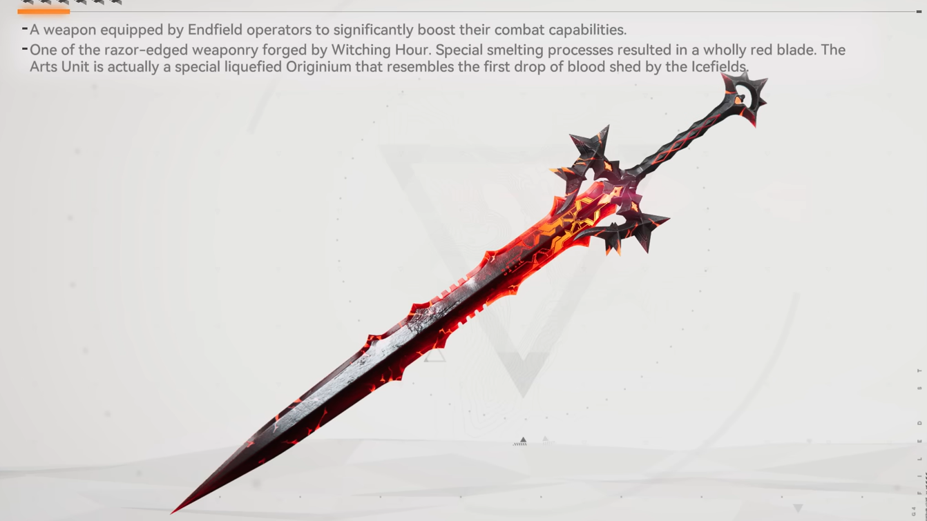 The weapon description frames it as elite Endfield‑manufactured equipment. Mechanically, its defining feature is a stress‑triggered energy storage mechanism, represented in‑game by an ATK buff that stacks when the wielder applies physical status.