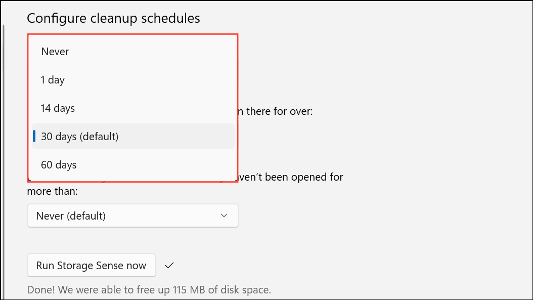 Step 3: Scroll to the section labeled Temporary Files. Locate the option Delete files in my Downloads folder if they haven’t been opened for more than. Click the dropdown menu and choose your preferred retention period. Options include Never, 1 day, 14 days, 30 days, or 60 days. Selecting Never prevents Storage Sense from deleting anything in Downloads.