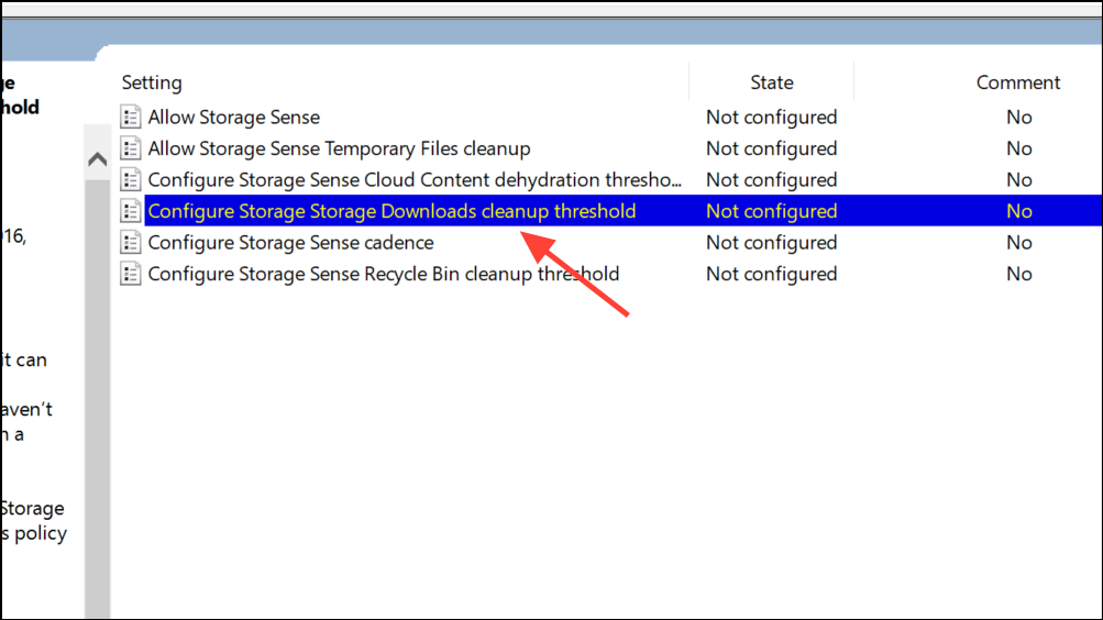 Step 3: In the right pane, double-click the policy named Configure Storage Sense Downloads cleanup threshold.