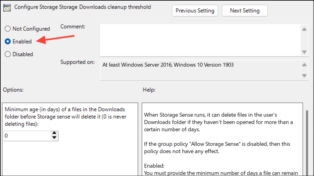 Step 4: Set the policy to Enabled and specify the minimum number of days a file can remain unopened before deletion. Enter 0 to prevent Storage Sense from deleting any files in the Downloads folder, or set a value between 1 and 365 to define a custom threshold.