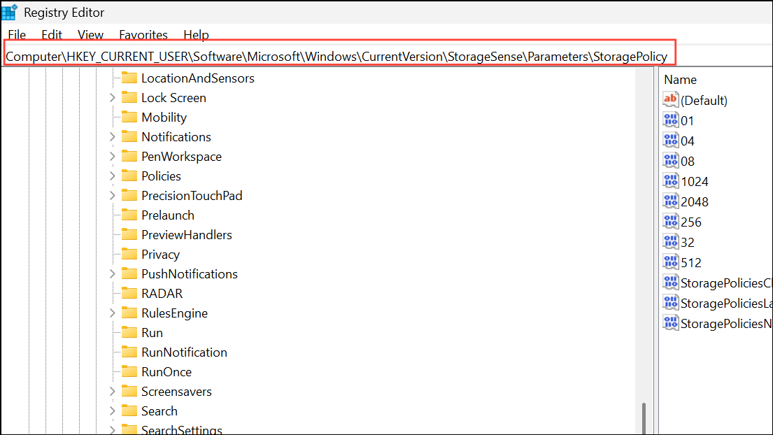 HKEY_CURRENT_USER\Software\Microsoft\Windows\CurrentVersion\StorageSense\Parameters\StoragePolicy