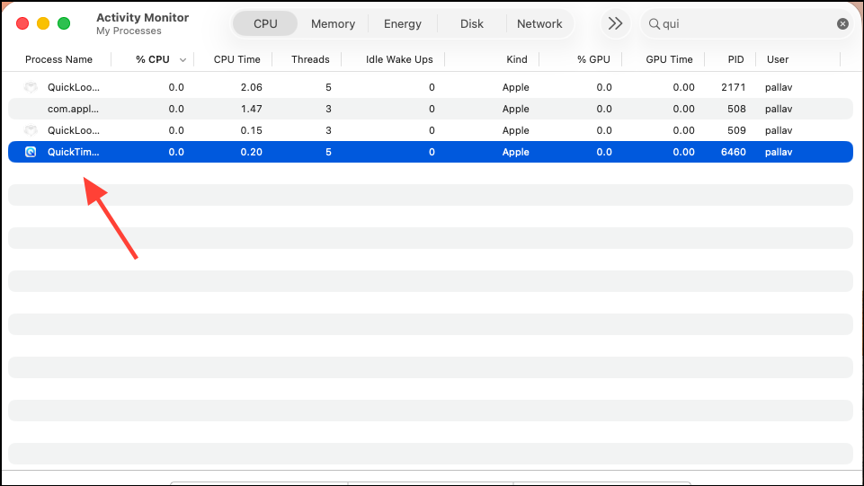 Step 2: Find the process named “QuickTime Player” or “ScreenSnapShot” (for the Screenshot tool), select it, and click the quit (X) button. Choose “Force Quit” to immediately terminate the process.