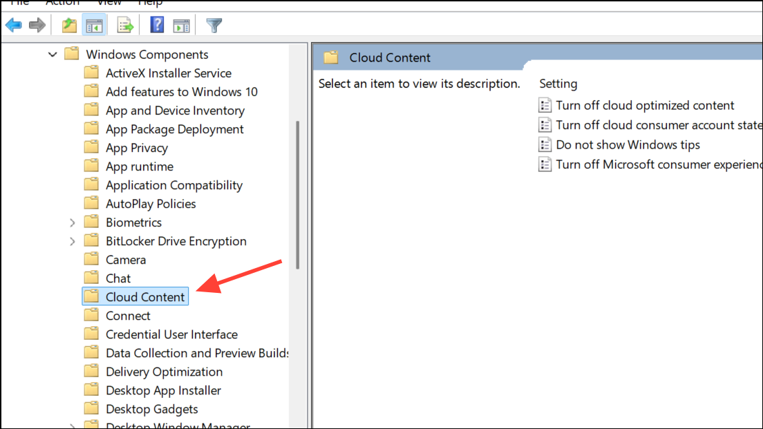 Step 2: In the Group Policy Editor, navigate to Computer Configuration > Administrative Templates > Windows Components > Cloud Content.