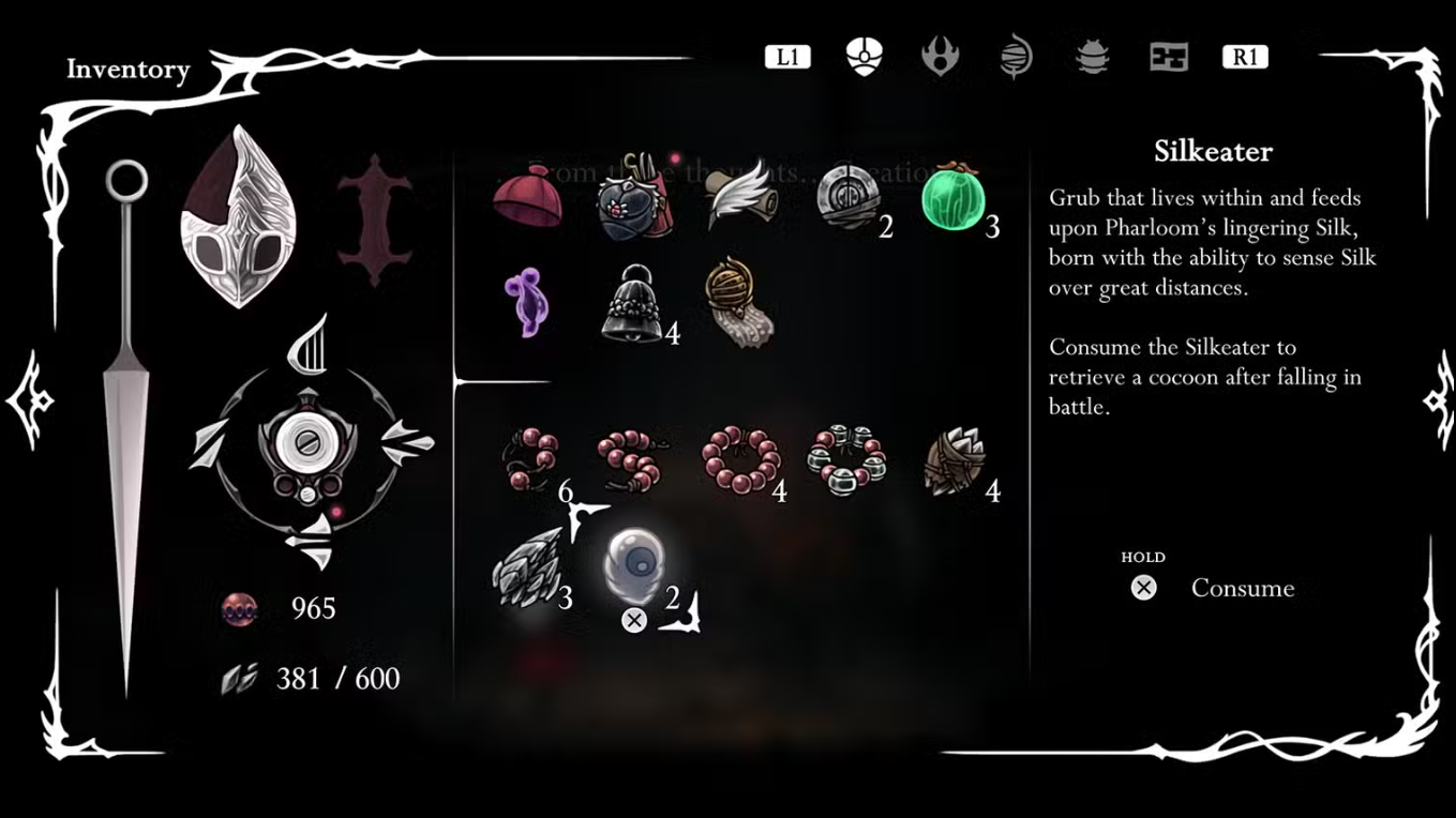 Silkeaters are single‑use items. Consume one, and Hornet bursts her silk cocoon remotely; you regain the Rosary Beads you dropped on death without trekking back to the body. Mechanically, it’s a pressure valve for exploration and boss practice: you can bank your economy from anywhere, then keep pushing forward instead of detouring to recover.