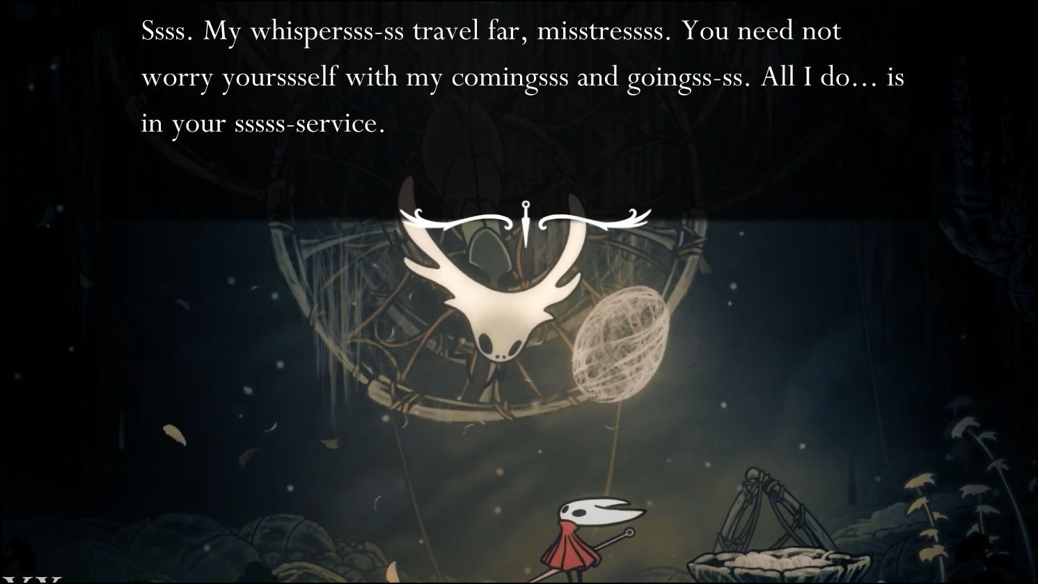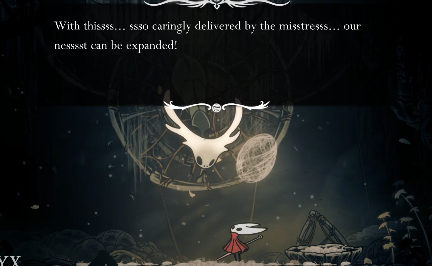 Styx speaks in sibilant reverence, insisting Hornet is his “mistress” and pledging to “grow morsels” while she hunts. He comments while weaving, announces when a Silkeater is ready, and even reacts if you play the Needolin near the nest — a small flourish, but consistent with Pharloom’s broader song motifs.