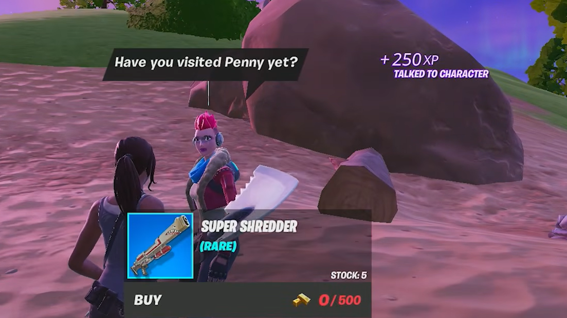 Step 4: Return to Jess. Her service menu now lists the Super Shredder Shotgun for 500 Gold Bars at Rare rarity. She stocks five per match, so up to five players in the same lobby can buy one.