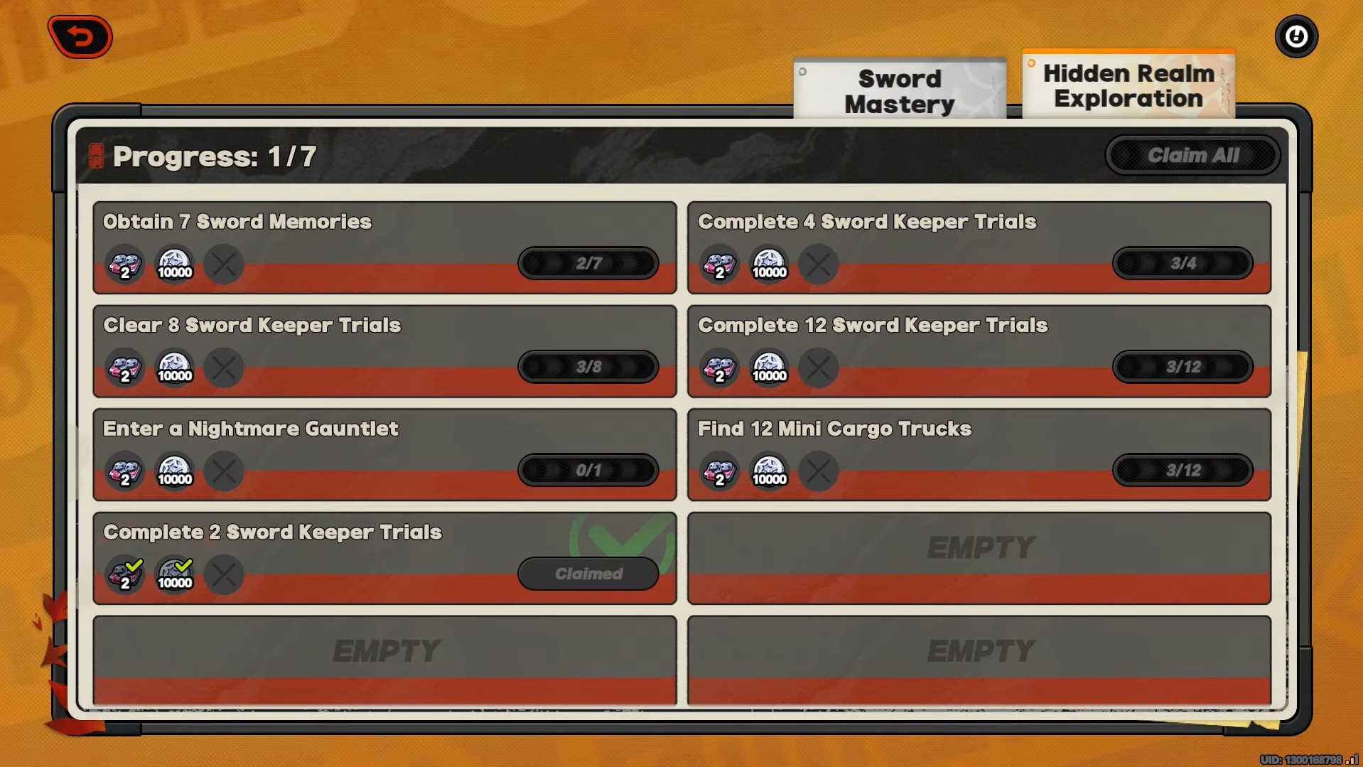 Step 1: Clear a mix of Sword Keeper's Trial stages and exploration content to earn Sword Mastery. Sword Mastery is the event currency that fuels Sword Will Resonance.