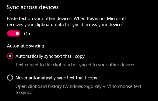 Step 5: After enabling synchronization, choose your preferred syncing option. You can select Automatically sync text that I copy if you want all copied items to sync automatically. Alternatively, choose Never automatically sync text that I copy if you prefer to manually select items to sync.