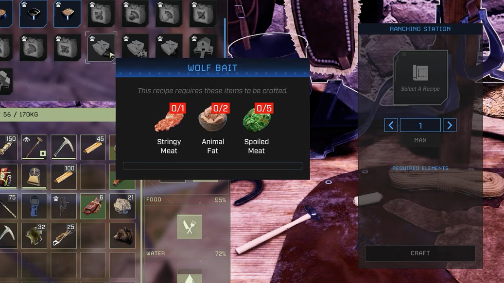 Wolf Bait is crafted at the Ranching Station using raw stringy meat, animal fat, and spoiled meat. It does not decay in your inventory and only functions when slotted into a snare placed in Forest, Grassland, or Arctic biomes.