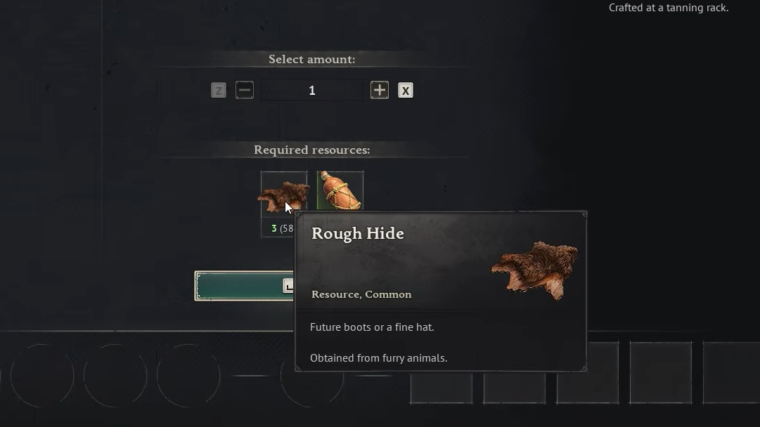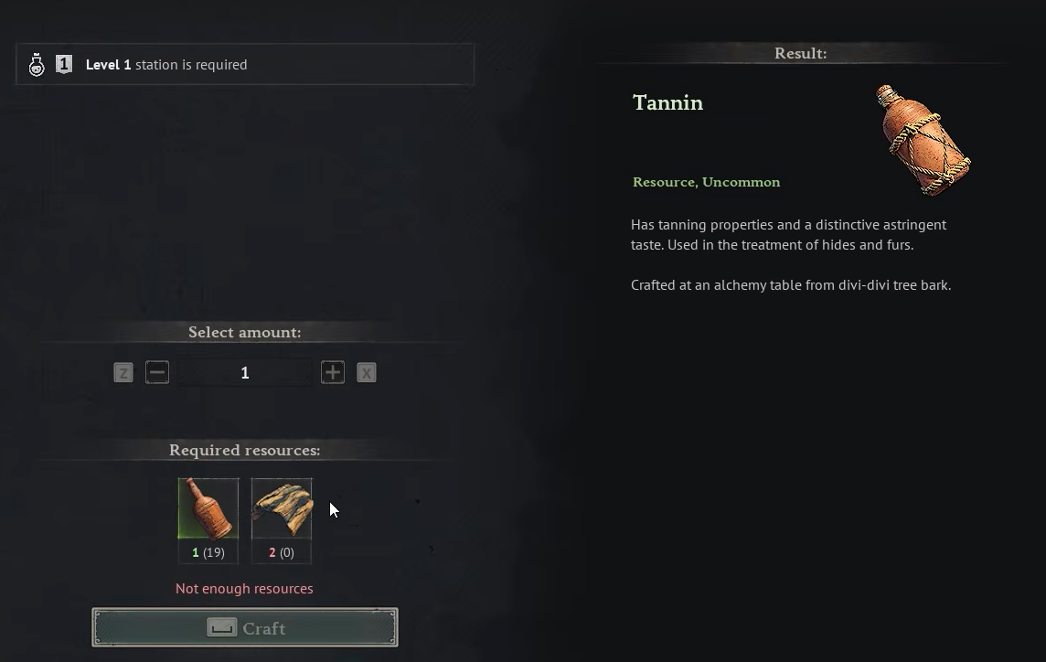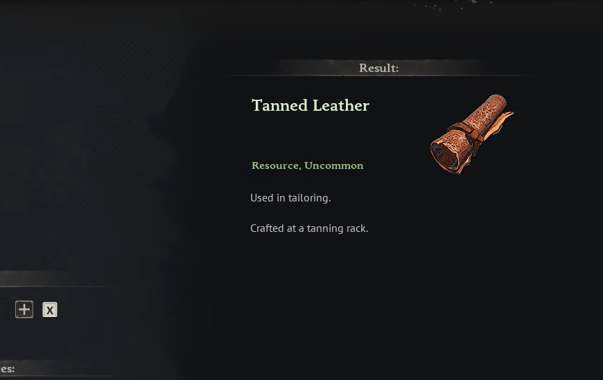 - You have Rough Hide but no Tannin, or vice versa, so the recipe stays greyed out.