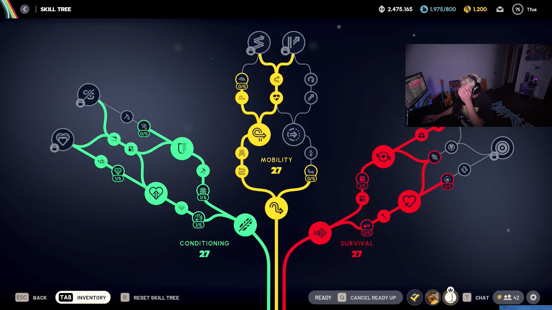 Quick answer: Tfue's build maxes out Broad Shoulders (5/5) and Looter's Luck (5/5) in the Survival tree, then invests heavily in movement speed and stamina recovery through Conditioning and Mobility nodes.