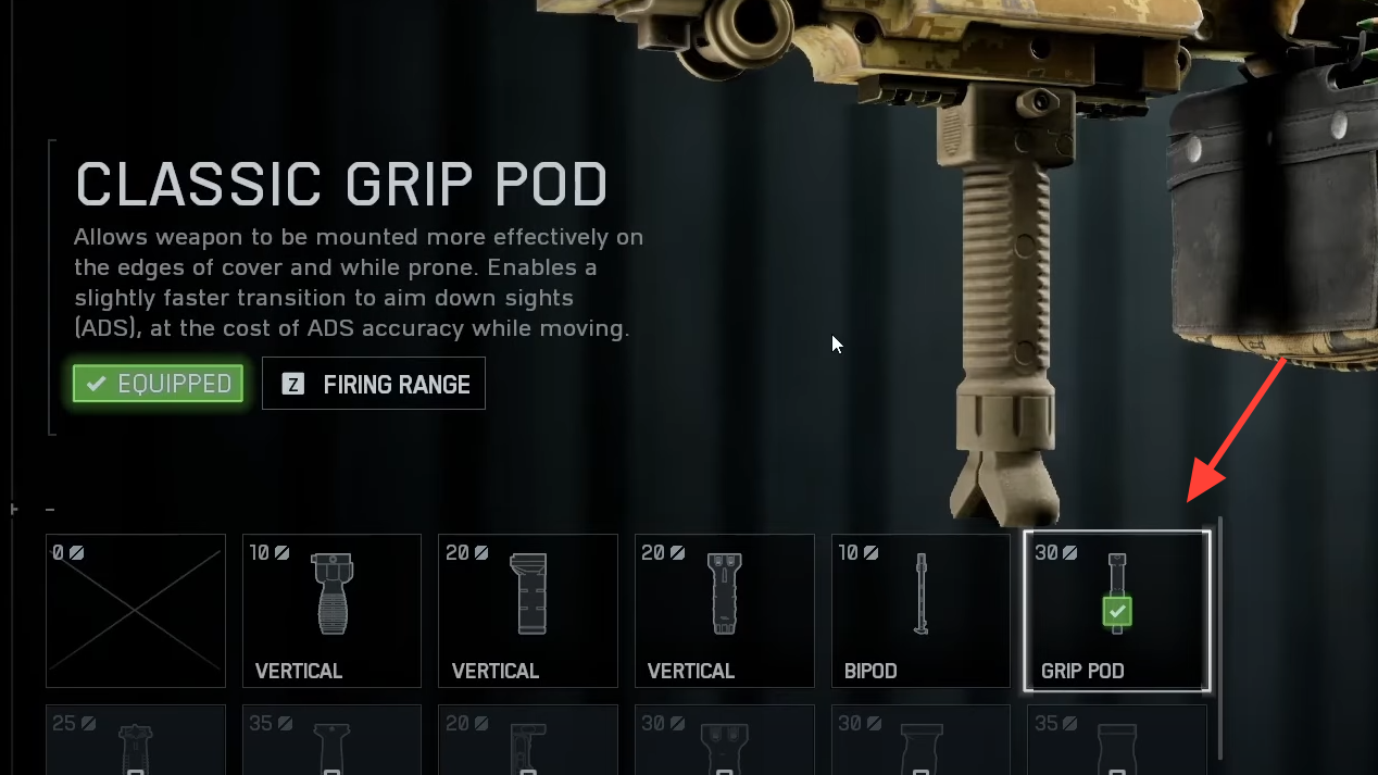 Build for range and consistency, then leverage LMG strengths. The Classic Grip Pod is the centerpiece: mount on cover edges or deploy prone for laser‑steady recoil, and it even helps ADS speed versus basic bipods. With that stability, a 3.00X optic becomes practical for long lanes. The 465MM LB extends effective range and bullet speed; Flash Hider remains the most budget‑friendly concealment pick for a sit‑and‑hold style. Tungsten Core continues to reward posted play by punching through light cover while you anchor objectives.