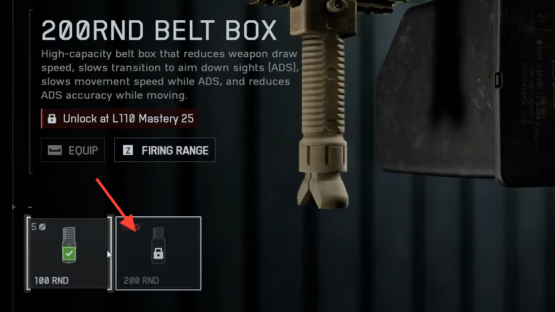 When you want to drown pushes in bullets, the 200‑round Belt Box is the late unlock that changes roles. Expect heavier recoil and slower handling, so keep the sight picture simple with a 1.00X and add the Single‑Port Brake for a touch more control. The 5 MW Green laser boosts hipfire at close range (and is visible to enemies), which fits the aggressive, suppressive intent of this setup. Stick with the Heavy barrel to stay within budget. Tip: if you prefer snappier handling, drop the optic and swap to the Light 349MM Fluted barrel to reallocate points without exceeding 100.