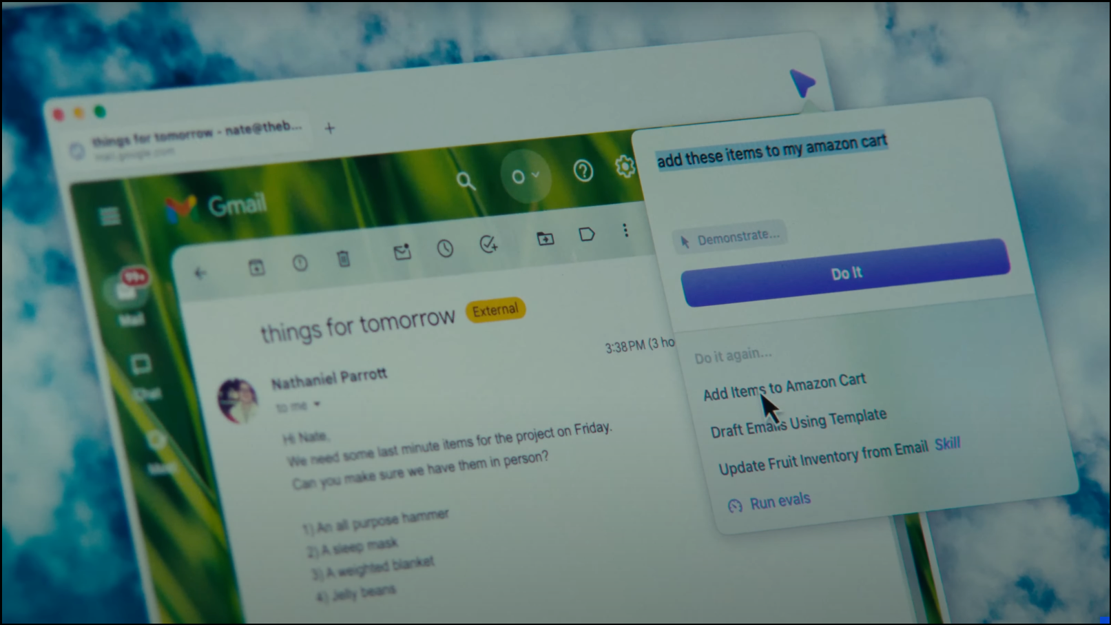 Lastly, they serve up the demo for the Self-Driving Cursor. Accessible through an icon that looks like the mouse cursor, it lets you automate processes in your browser. In the example, Dia browser goes to Miller's Amazon and adds all the products to his cart that he received in an email list.