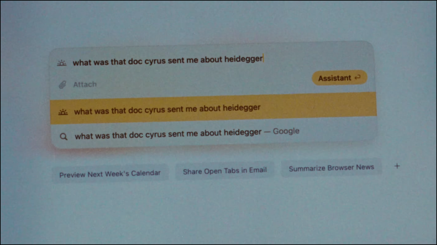 Another demo involved a reimagined URL bar, which the company previously reimagined in Arc, as the Command Bar. The new interface seems similar to the Command Bar. But it's the "Recall-like" functionality that's new.