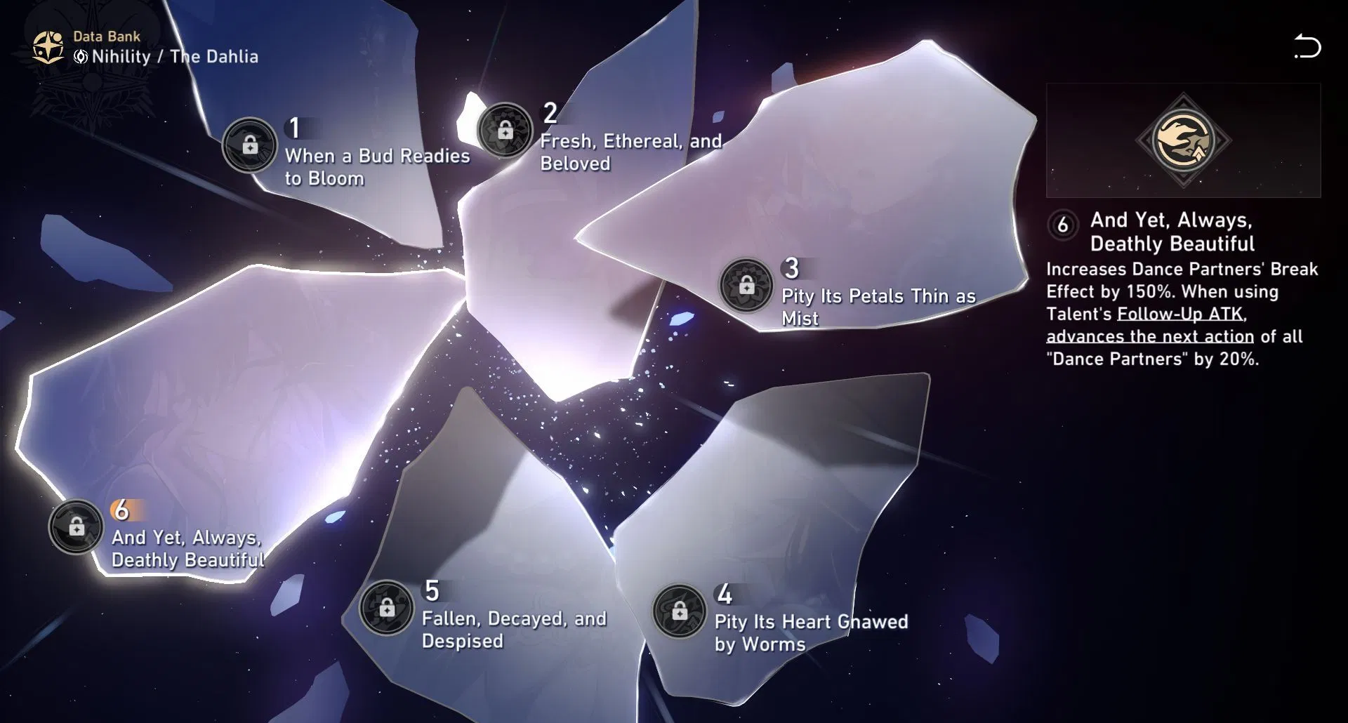 E3 – Pity Its Petals Thin as Mist. This Eidolon raises The Dahlia’s Ultimate by 2 levels and Basic ATK by 1. Extra Ultimate scaling is welcome because her Ultimate both damages and applies Wilt (DEF reduction plus weakness implants), but the improvement is incremental. Basic ATK scaling matters very little on a support who uses Basics mainly for Skill Point management.