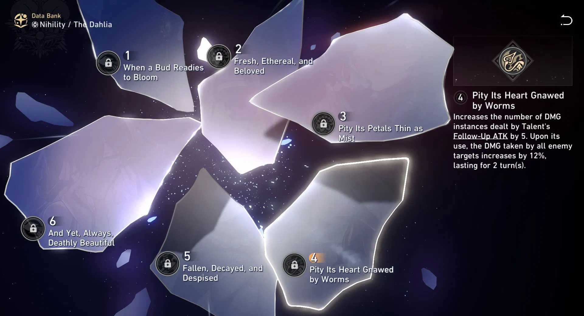 E3 – Pity Its Petals Thin as Mist. This Eidolon raises The Dahlia’s Ultimate by 2 levels and Basic ATK by 1. Extra Ultimate scaling is welcome because her Ultimate both damages and applies Wilt (DEF reduction plus weakness implants), but the improvement is incremental. Basic ATK scaling matters very little on a support who uses Basics mainly for Skill Point management.