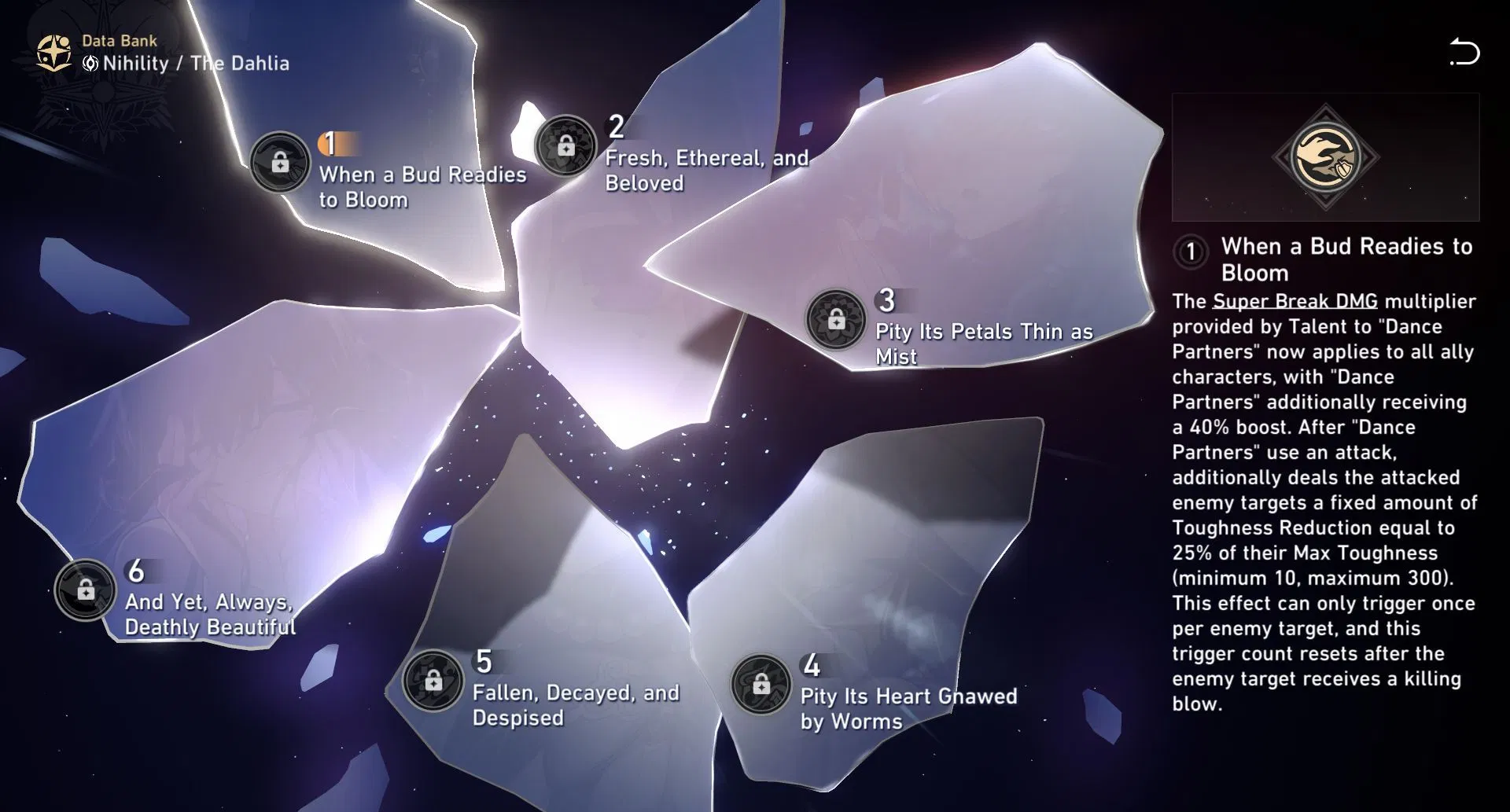 | 3 | E1 – When a Bud Readies to Bloom | Spreads her Talent’s Super Break bonus to the whole team and adds a one-time fixed Toughness chunk. | Situational; good in some matchups, but generally weaker than her signature light cone or E2. |