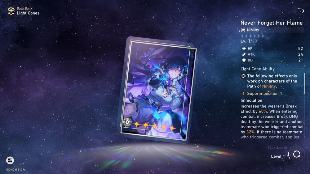 The Dahlia’s signature Nihility light cone, “Never Forget Her Flame”, is a key part of her vertical scaling. It provides a large Break Effect stat and a substantial Break DMG bonus to both her and one ally, along with some Skill Point restoration on weakness implants. For break-focused teams, this functions as a multiplicative damage boost to the main carry on top of her base kit.