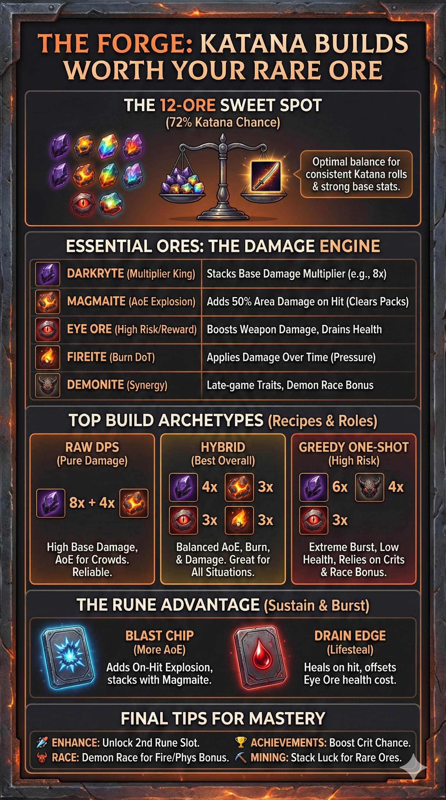 Strong Katanas in The Forge come from a clear priority list, not blind gambling: 12‑ore recipes to keep Katana chances high, Darkryte as the damage spine, Magmaite and Blast Chip to handle crowds, Eye Ore and Fireite for boss‑killing pressure, and Drain Edge to make all that aggression sustainable. Once those foundations are in place, chasing small upgrades in rune rolls and ore tiers turns the weapon from “very good” into something that can comfortably shred even the toughest enemies in the game.