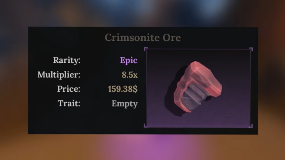 | Ore | Rarity | Drop Chance | Drops From | Multiplier | Price | Trait |