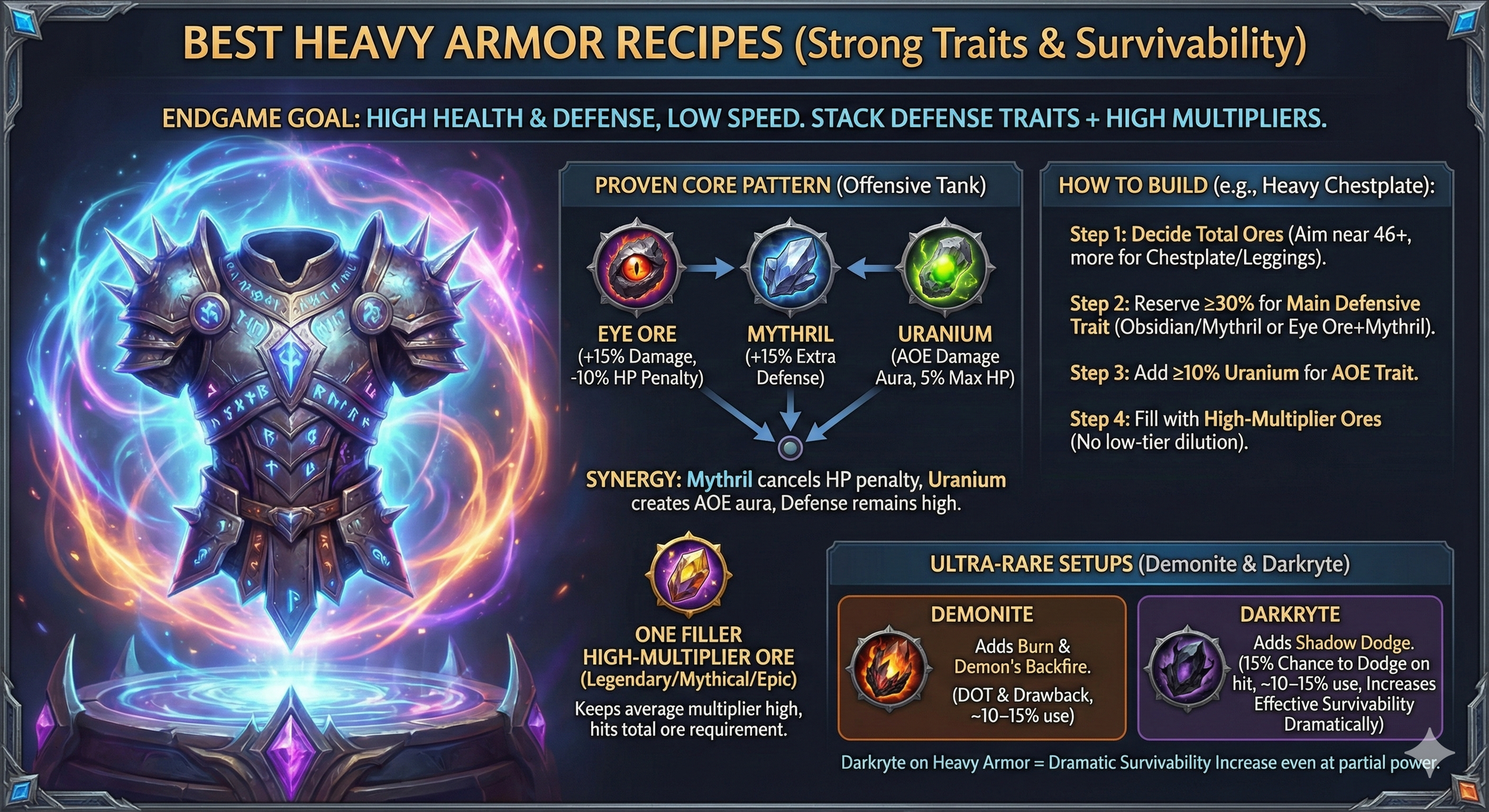 Heavy armor is the endgame target for most players because it packs the highest Health and Defense. The tradeoff is movement speed, so the goal is to stack defense traits while using multipliers strong enough to justify the slow playstyle.