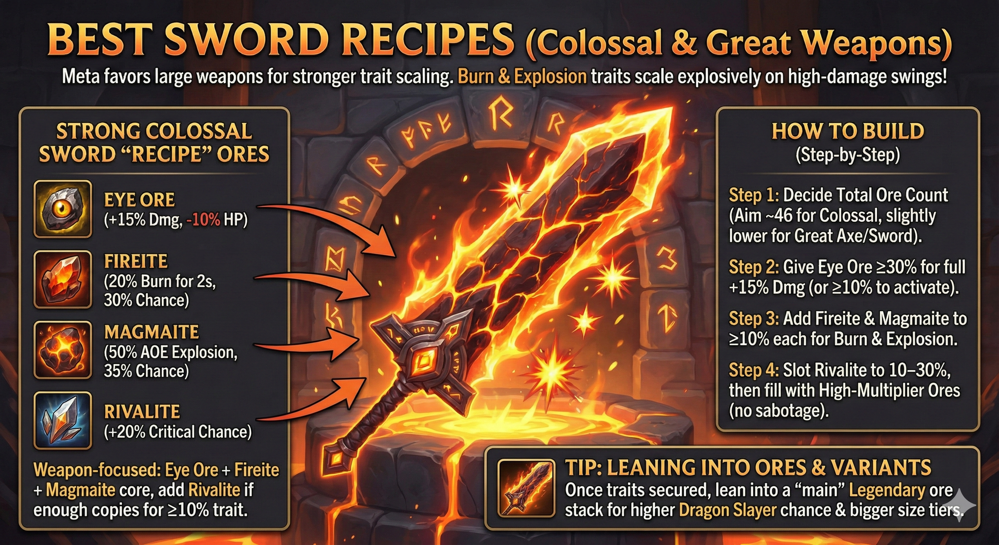 Tip: Once trait percentages are secured, you can lean into one “main” ore—such as a specific Legendary you have stacked—to increase the chances of rolling certain weapon variations, including Dragon Slayer on a Colossal Sword. Large single‑ore pools also naturally raise the probability of hitting the biggest size tiers.