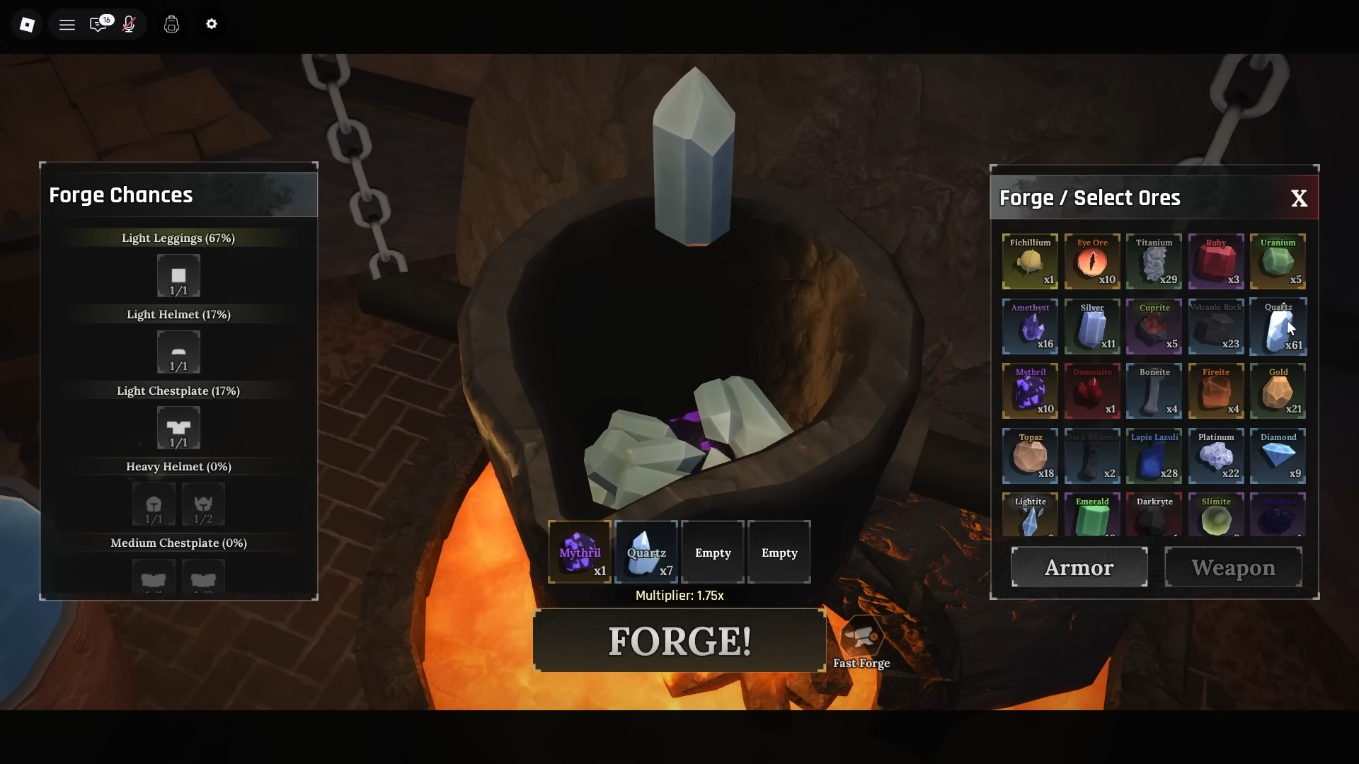 Once you understand how ore counts, multipliers, and trait thresholds interact, “recipes” in The Forge stop being guesswork. For armor, anchor around Eye Ore, Mythril, Uranium, and, if you can get them, Demonite or Darkryte to build Heavy sets that feel unkillable. For weapons, lean into Colossal or Great weapons loaded with Eye Ore, Fireite, Magmaite, and Rivalite, then refine them with enhancements and runes. From there, it is just repetition—mining Forgotten Kingdom rocks, rolling the crucible, and chasing that perfect Dragon Slayer or Dark Knight drop.