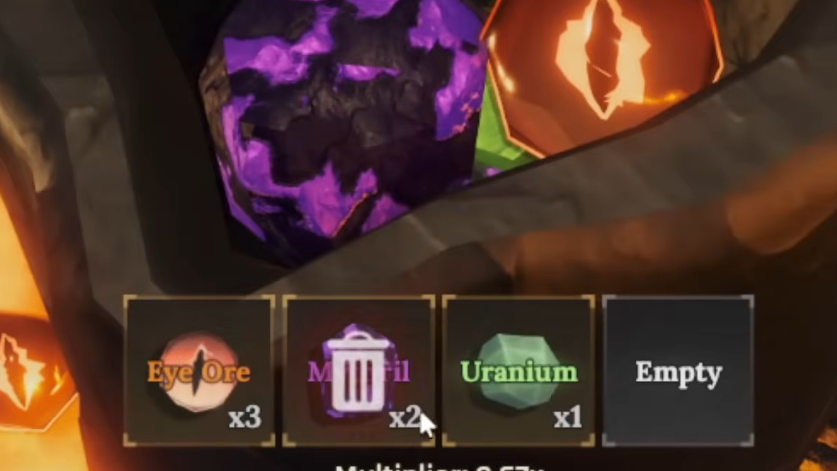 This is a low-friction crafting check with no ore restrictions. Use three of your lowest-tier ores to keep the cost down and quickly craft cheap items, such as basic Daggers or Lightweight Helmets. If your pickaxe struggles on Island 3 ores, mine on earlier islands, then come back to any forge to complete the recipe requirements.