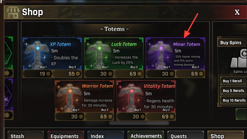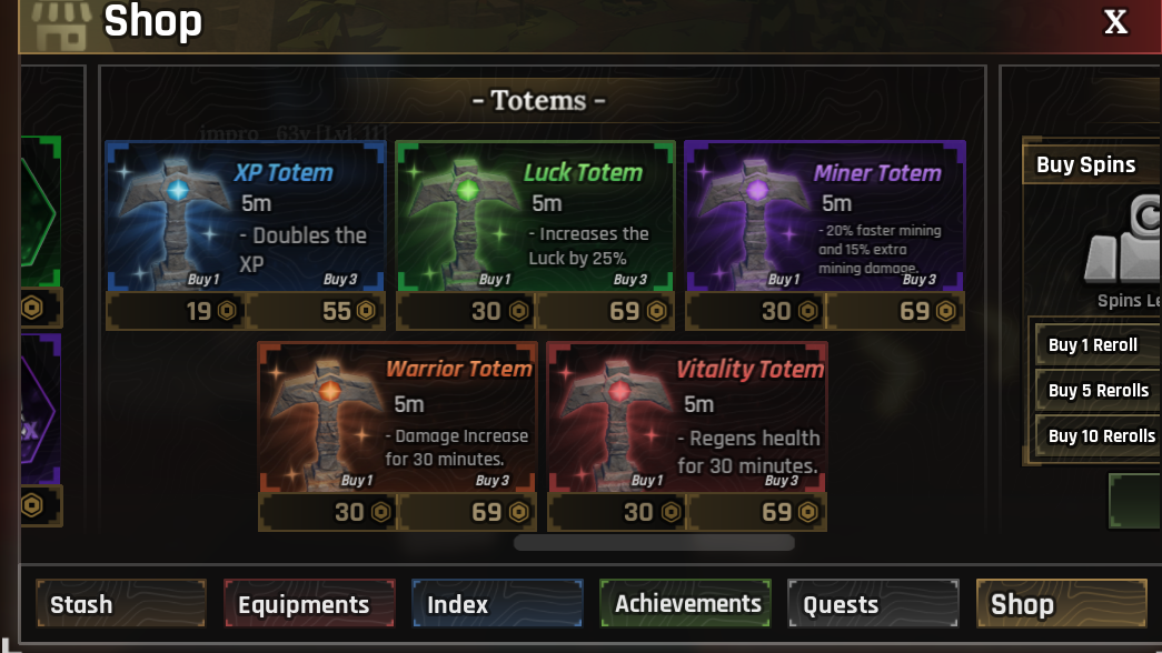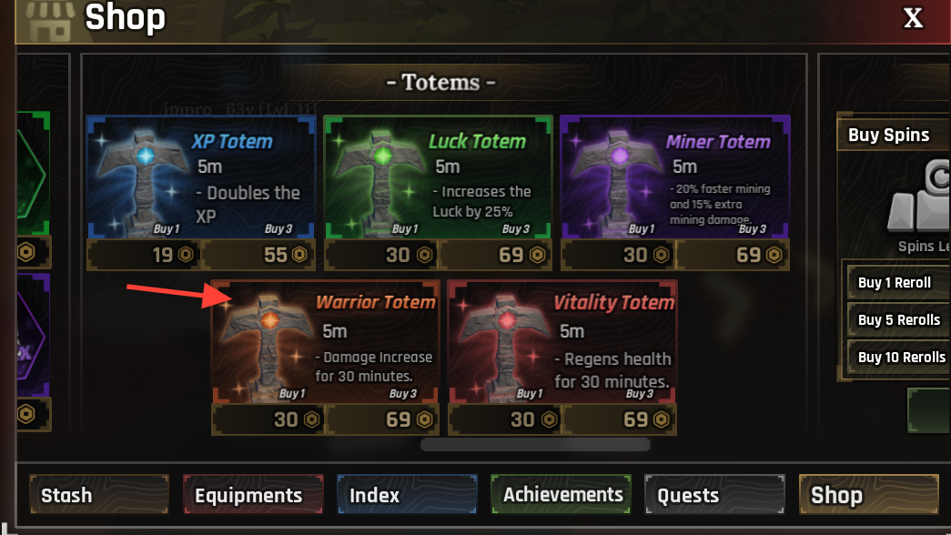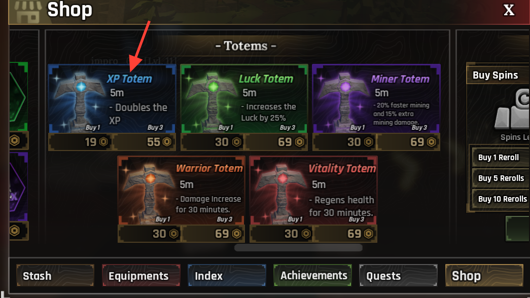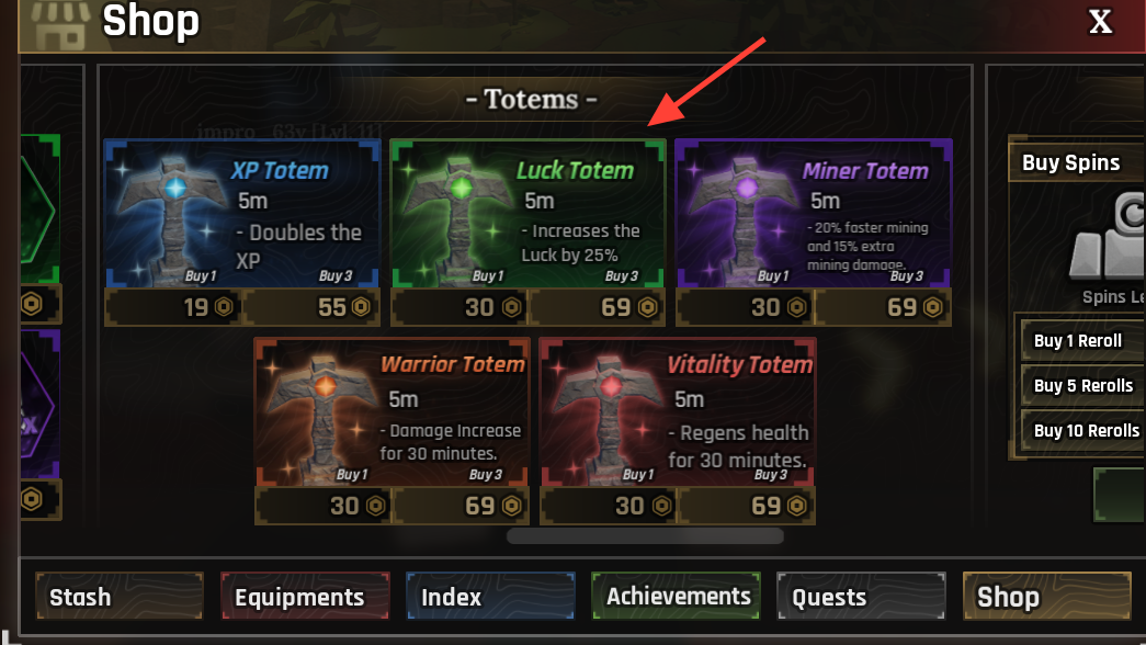 | Luck Totem | +50% Luck | 5 minutes | 1 for 75, 3 for 169 |