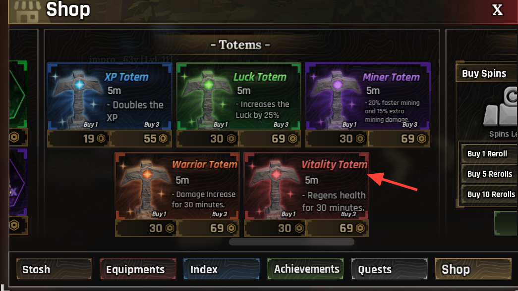 | Vitality Totem | Health regeneration | 30 minutes | 1 for 75, 3 for 169 |