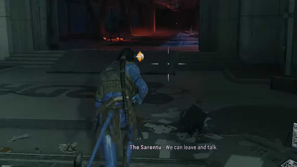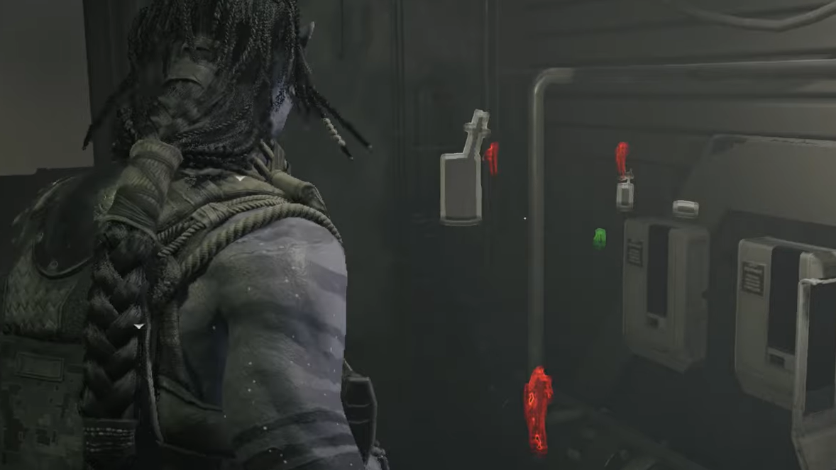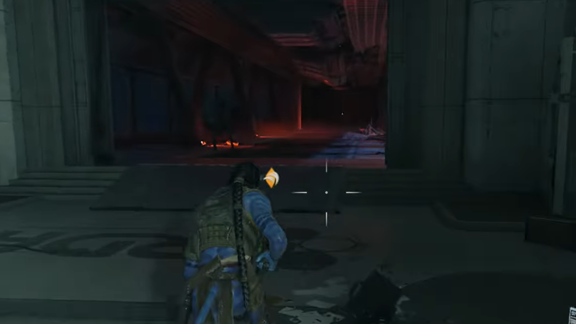 Step 4: Use Na’vi Senses before and during the fight. Na’vi Senses highlight enemies, their armor, and obvious weak points, giving you better target priority. Open the door, push into the hangar, and work from cover to thin out the first wave quickly. When you make it out of the hangar space and hit the next checkpoint, the second objective is marked complete.