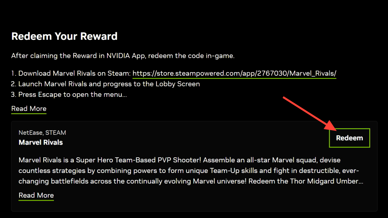 Step 3: Click the Marvel Rivals tile, then press Redeem. The app will push you to the Nvidia website, where you may need to sign in again.