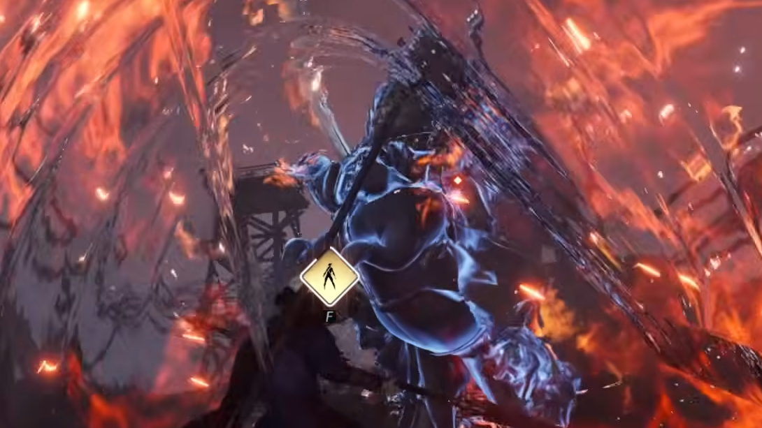 Sunrush Gale is the AoE special tied to the tilde key. It consumes 2 bars of Fighting Spirit to slam the Mo Blade into the ground, creating a vortex that pulls nearby non-boss enemies toward you, then follows up with a sweeping spin. During the entire sequence, you gain Fortitude, and at the end, you gain Focus, accelerating your next charged attack.