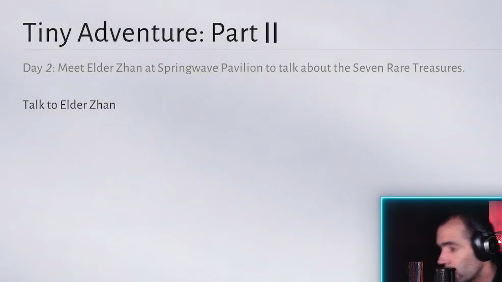 Step 2: Wait for a letter from Elder Zhan titled “Seven Rare Treasures Have Emerged” to arrive. Read this letter in your mailbox to formally unlock Tiny Adventure: Part 2 in your quest list. If you ran Part I and II back to back and the letter does not appear, advance in-game time or do other activities for a short while, then check again.