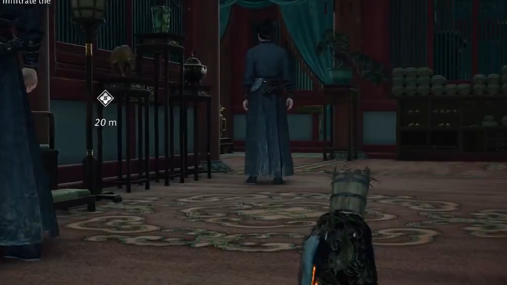 Step 5: After crossing the second-floor hall, work your way toward the next staircase leading to the third floor. NPCs that walk behind seated guests provide natural timing windows; move when they have just passed you and keep a small buffer distance, as their collision area is slightly larger than their visual model. Near the final guard before the stairs, you can either Shadow Step onto a nearby table and slip behind him or circle around from the open side of the corridor.