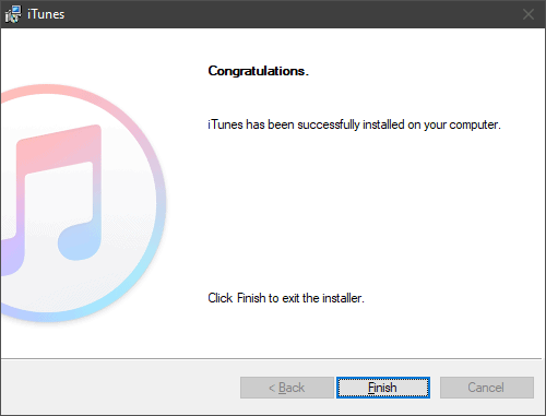 Follow the onscreen instructions on the iTunes installer to complete the installation. Once done, a ‘Finish’ prompt will appear on the iTunes installer.
