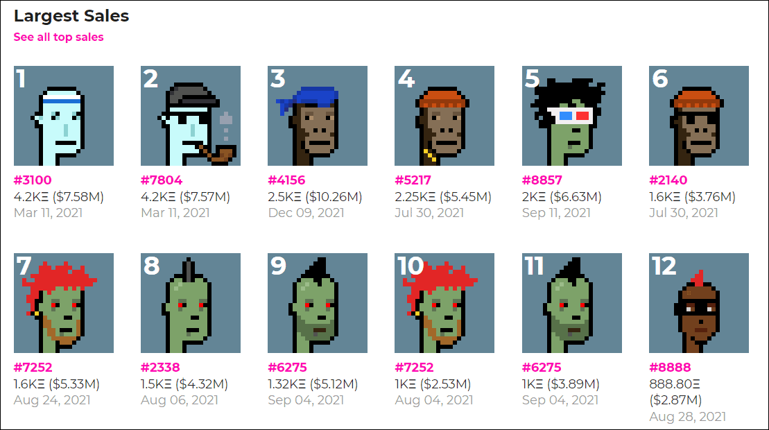 The only expense was the gas fee, which in those days was negligible due to light network usage and obscurity of the CryptoPunks project. Fast-forward to now, and the only way to get your hands on a CyprtoPunk collectible is by paying at least 61 ETH (that’s around $237,000 right now). That’s the lowest price for a CryptoPunk at the time of writing this. The highest sale of a CryptoPunk was for $7.58 million. You’ll find all others in-between this price range.