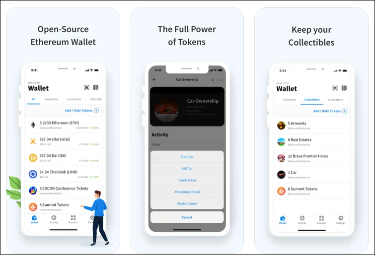 Like most mobile wallets, it also has a built-in browser for exploring NFT marketplaces and other DApps. It also has an option for creating and minting NFTs. The wallet also works directly with apps like CryptoKitties, OpenSea, Dragonoreum, and ChainZ Arena, among other NFT marketplaces. It is compatible with most in-game assets on the Ethereum blockchain.