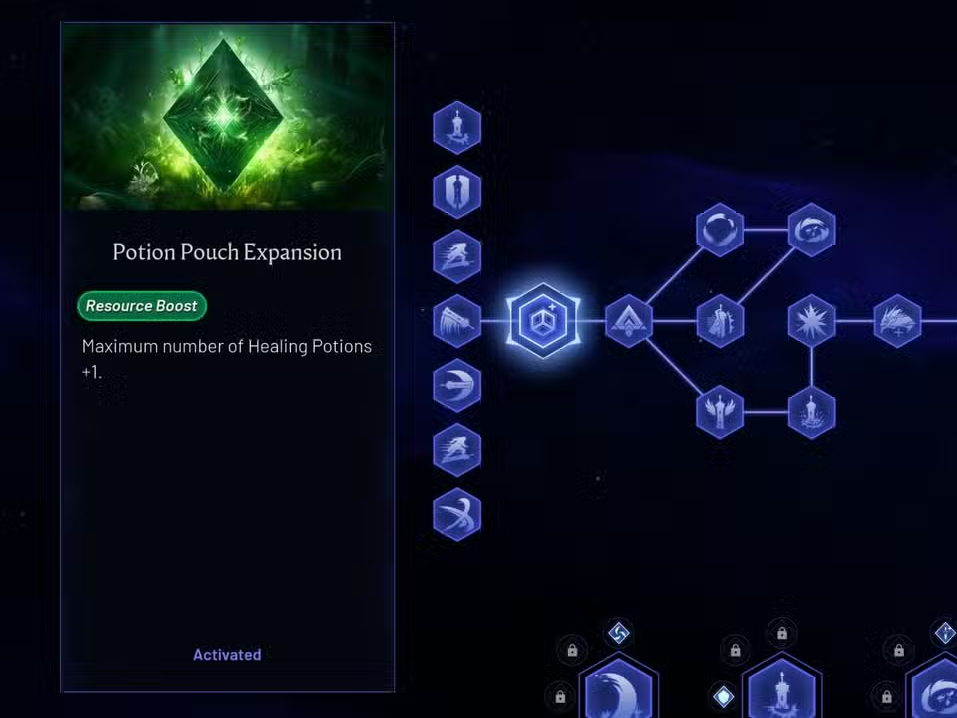 More heals means more mistakes you can recover from while learning bosses. Each weapon tree includes a Potion Pouch Expansion node; unlocking them across multiple trees stacks the total potions you can carry. This single upgrade smooths difficulty spikes and reduces downtime between encounters.