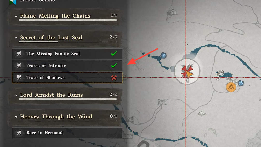 Trace of Shadows is a House Serkis faction quest in Crimson Desert that follows up on Traces of Intruder, sending you to dig and search for two more notes left by the Great Thief of Hernand. The objectives are short on paper but easy to fumble, mostly because the dig prompts are finicky and the Duskwood clue is tucked inside a stone puzzle.