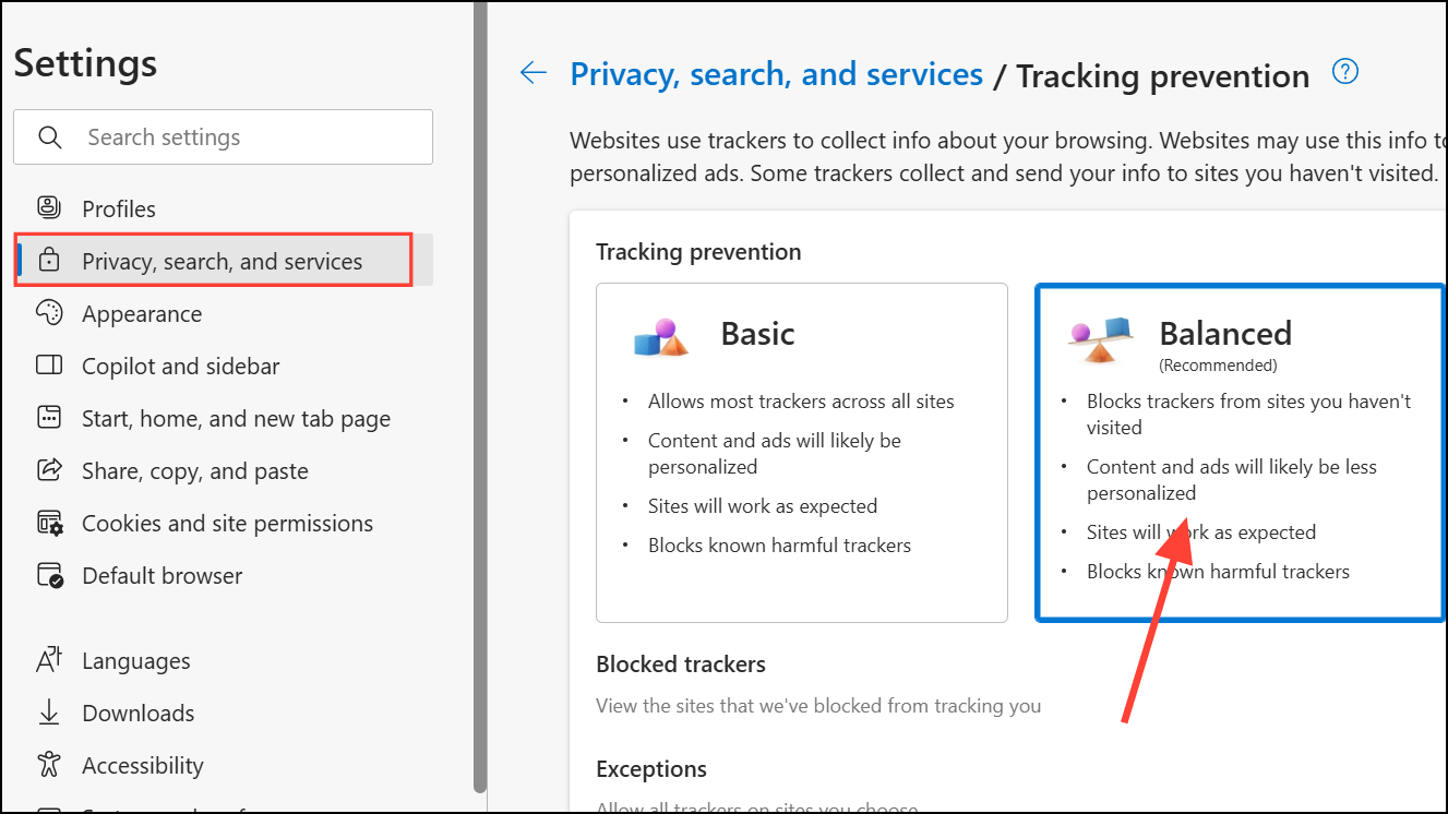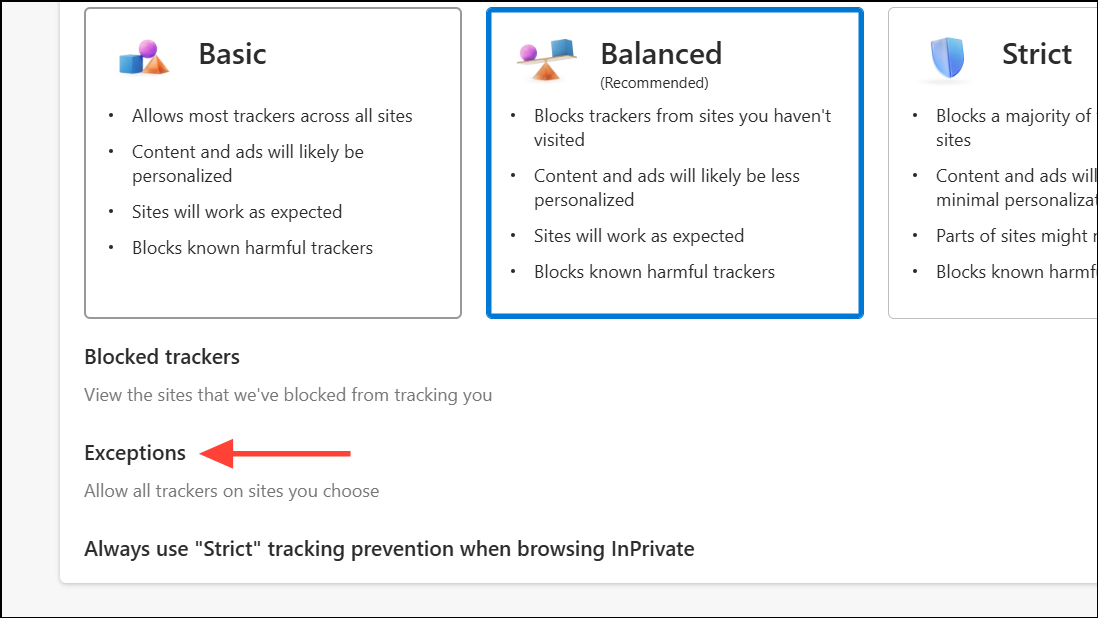 Step 3: Set Tracking Prevention to “Balanced” or “Basic.” This reduces the likelihood of false positives while maintaining some privacy protections.