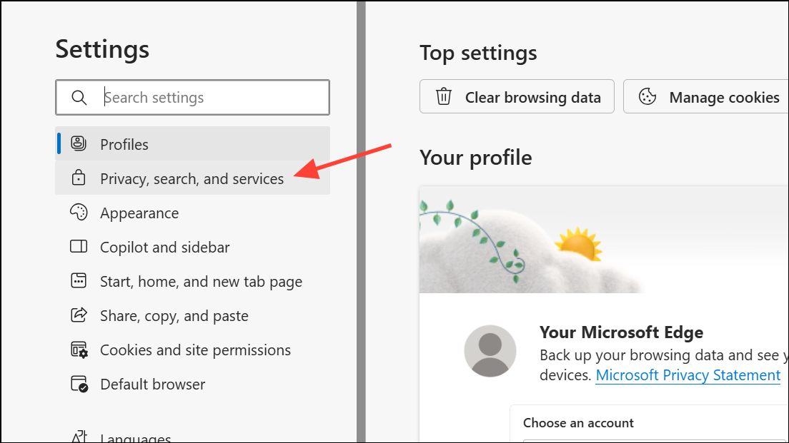 Step 2: Click on Privacy, Search, and Services on the left.