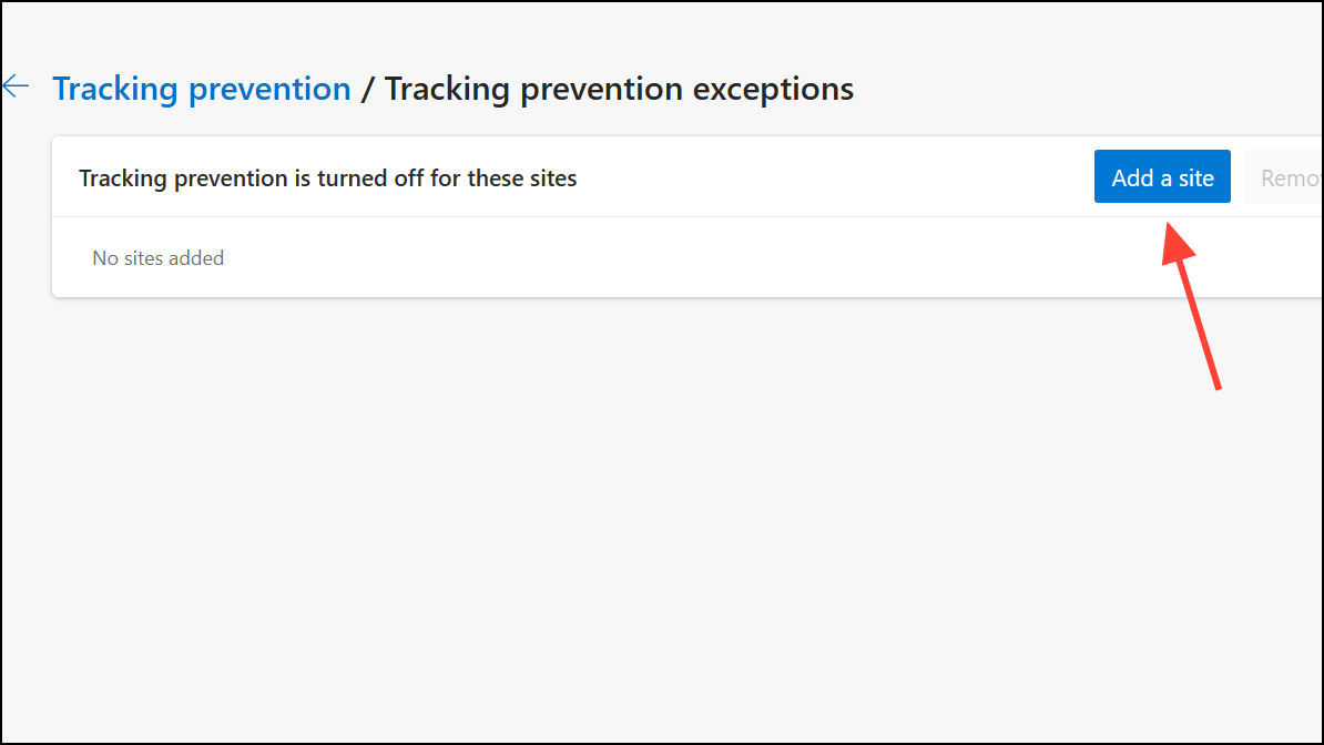 Step 5: Click the Add a site button on the top, and add youtube.com so Edge’s privacy features won’t interfere with YouTube’s scripts.