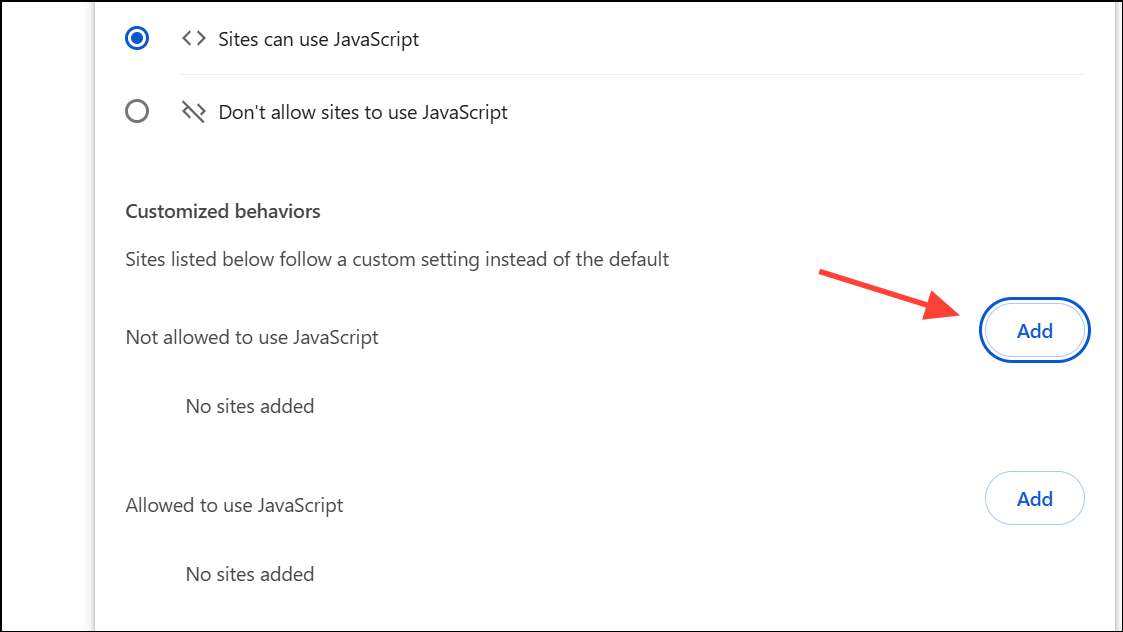 Step 3: Add youtube.com to the “Not allowed to use JavaScript” list. This blocks scripts responsible for detecting ad blockers and displaying popups.