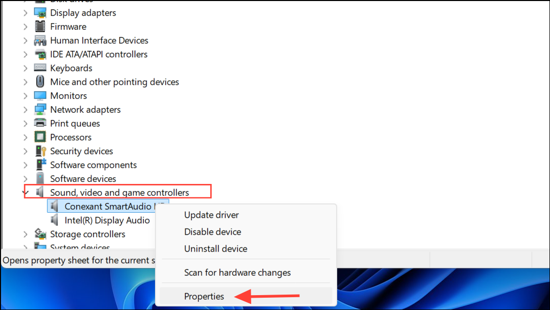 Step 2: Expand the Sound, video and game controllers section. Right-click your audio device and select Properties.
