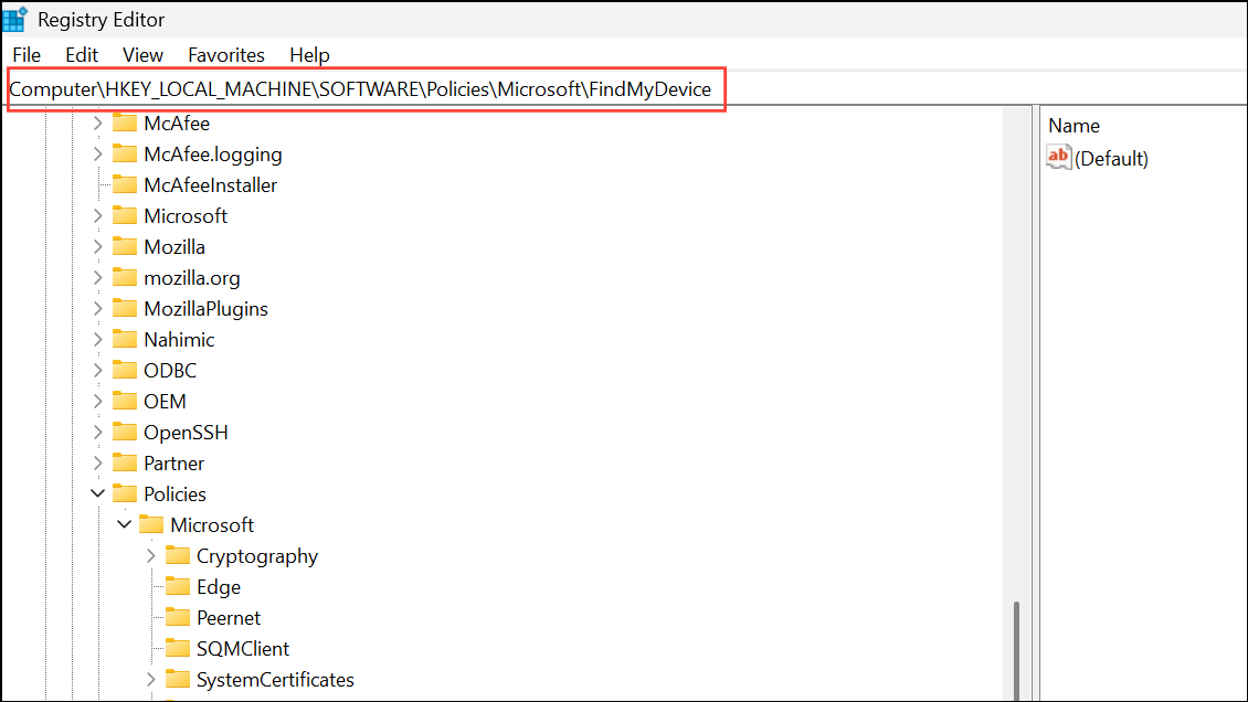 HKEY_LOCAL_MACHINE\SOFTWARE\Policies\Microsoft\FindMyDevice
