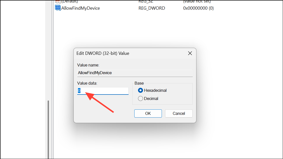 Step 4: Double-click AllowFindMyDevice and set its value data to 0. This disables Find My Device at the system level.