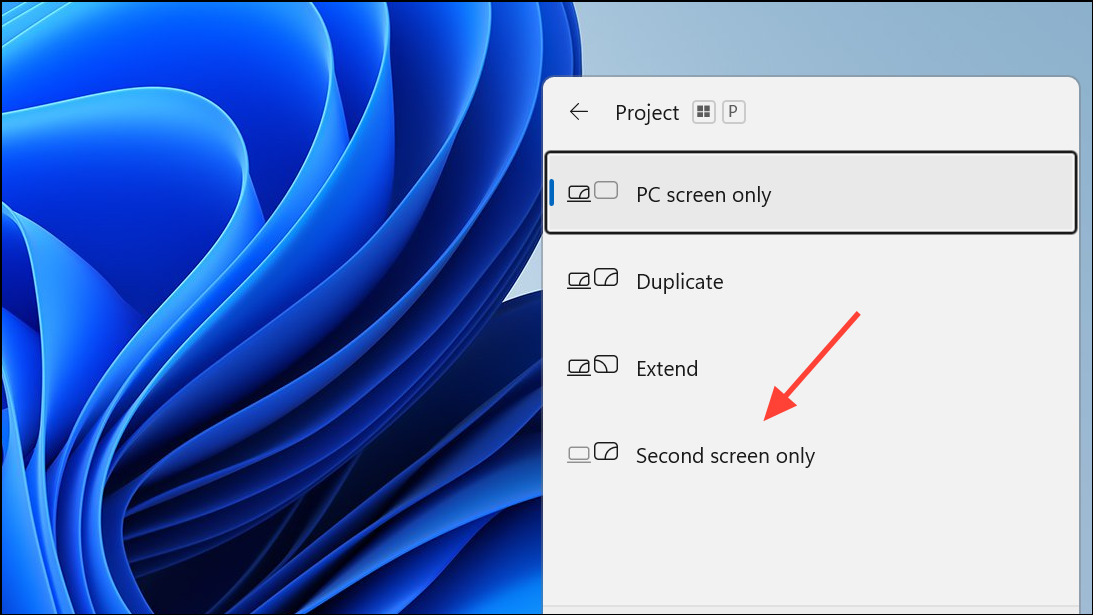 Step 2: A sidebar will appear with several projection options: PC screen only, Duplicate, Extend, and Second screen only. Select Second screen only by clicking it or by using the arrow keys and pressing Enter. This setting disables your laptop’s built-in display and routes all output to the connected external monitor(s).
